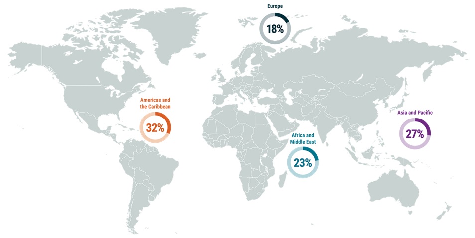En lo que respecta al nivel educativo dominante por región, Europa es la excepción, ya que el 48% de los encuestados tiene un título de máster. Tanto en América/Caribe como en África/Oriente Medio, el 46% tiene una licenciatura, mientras que en Asia/Pacífico esta cifra se reduce al 42%.