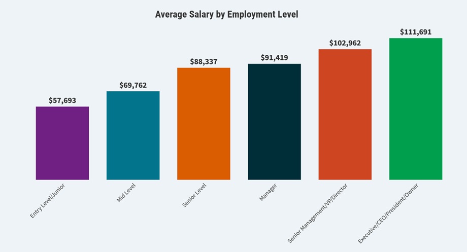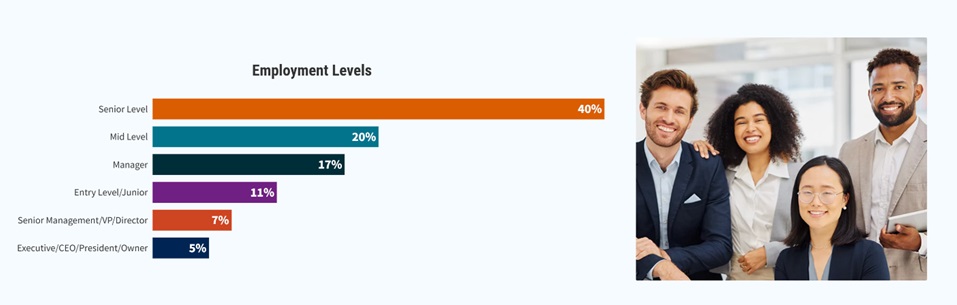 Comprender las tendencias de empleo es fundamental para la planificación estratégica y profesional. Entre los encuestados, el 77% está empleado a tiempo completo, el 6% trabaja como consultor y el 5% está desempleado. Los encuestados que trabajan por cuenta propia, estudiantes y empleados a tiempo parcial representan el 4% cada uno.
